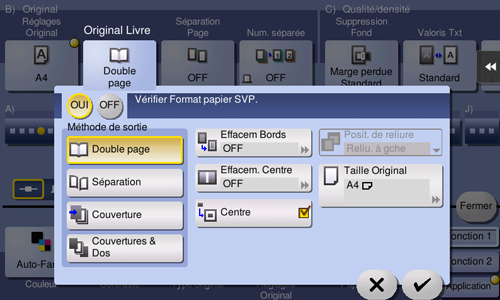 Tapez sur [OUI], sélectionnez [Double page], puis tapez sur [Effacer Centre].