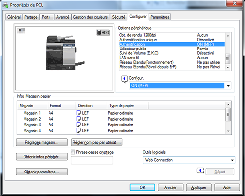 Depuis [Options périphérique] de l'onglet [Configurer], sélectionnez [Authentification] ou [Suivi de Volume (E.K.C)] et sélectionnez l'option cible dans [Configurer].