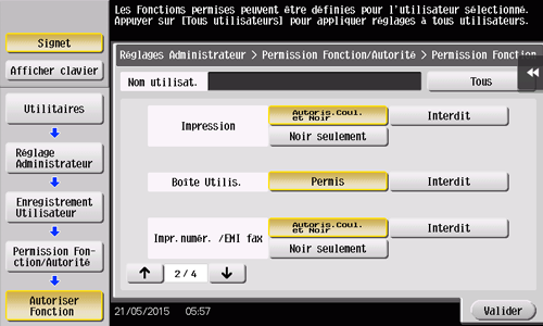 Dans [Impression], sélectionnez [Autoris.Coul. et Noir] ou [Noir seulement] et tapez sur [Valider].