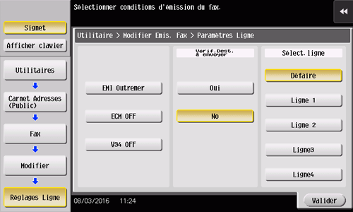 Tapez sur [Réglages Ligne], réglez [Vérif. Dest. & envoyer] sur [Non], puis tapez [OK].