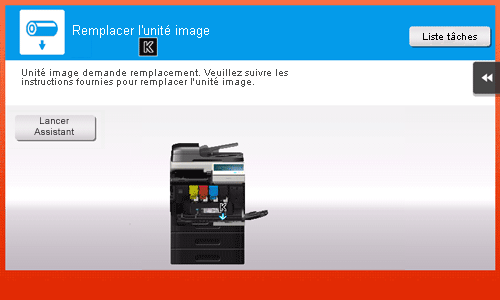 Lorsqu'il est temps de remplacer une unité image, un message vous y invite. Remplacez-la en fonction du contrat d'entretien. Tapez sur [Lancer Assistant] pour afficher la procédure de remplacement à l'écran et la vérifier.
