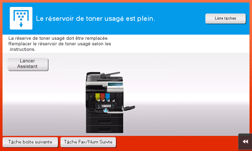Lorsque le flacon de toner usagé est plein, un message apparaît pour vous inviter à la remplacer. Remplacez-la en fonction du contrat d'entretien. Tapez sur [Lancer Assistant] pour afficher la procédure de remplacement à l'écran et la vérifier.