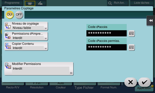 Procédure d'affichage : [Numérisation/fax][Type fichier][Réglages PDF détaillés][Cryptage]