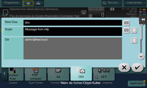 Lorsque vous effectuez un envoi par e-mail, vous pouvez spécifier l'objet et le texte du message e-mail et modifier l'adresse e-mail de l'expéditeur (adresse de l'expéditeur).