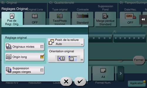 Procédure d'affichage : [Numérisation/fax][Application][Nombre d'originaux][Réglages Original][Original long]