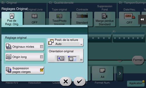 Procédure d'affichage : [Numérisation/fax][Application][Nombre d'originaux][Réglages Original][Suppression pages vierges]