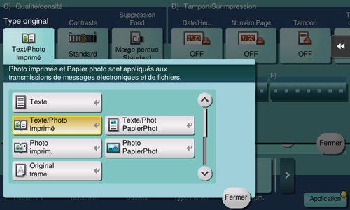 [Texte/Photo Imprimé] | Tapez sur ce bouton pour numériser un original comportant principalement du texte et des photos au niveau optimal de qualité d'image. Cette fonction accentue les bords de chaque caractère pour reproduire des photos plus douces. Sélectionnez cette option pour numériser des originaux imprimés tels que des brochures et des catalogues. |