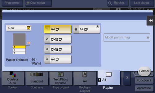 [Type de papier] : sélectionnez le type de papier chargé dans le magasin papier sélectionné. Si vous utilisez le papier ordinaire de 15-15/16 lb à 18-5/8 lb (60 g/m2 à 70 g/m2), tapez sur [Changer l'épaisseur]. Parmi les magasins contenant du papier ordinaire, le magasin papier dont la case [Changer l'épaisseur] est cochée est réglée sur une séquence de faible priorité. Toutefois, si la case [Changer l'épaisseur] est cochée pour tous les magasins papier, la séquence de priorité spécifiée dans [Sélection auto magasin] est disponible. Pour des détails sur [Sélection auto magasin], voir