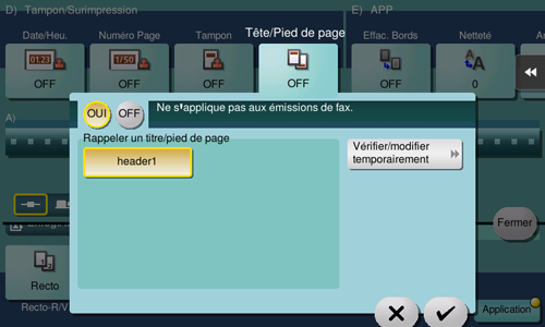 [Vérifier/modifier temporairement] | Si nécessaire, vérifiez ou changez temporairement les détails du programme qui est sélectionné dans [Rappel Tête/Pied de page].