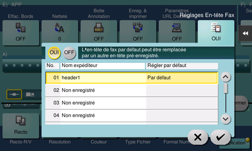 Procédure d'affichage : [Numérisation/fax][Application][Applications][Réglages En-tête Fax]