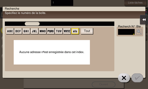 Cette fenêtre permet de rechercher une boîte utilisateur. Les boîtes utilisateur sont affichées sur la base des caractères de recherche que vous avez spécifié lors de l'enregistrement de la boîte.