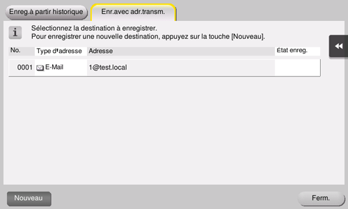 Si nécessaire, vous pouvez enregistrer des destinations affichées dans le journal d'émission, dans le carnet d'adresses. Pour des détails sur l'enregistrement, voir [Enregistrer depuis le journal d'émission] .