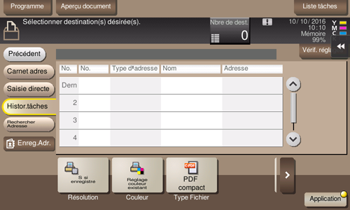 Tapez sur [Histor.tâches], puis sélectionnez une destination depuis l'historique des numérisations ou des fax. Pour les besoins de l'historique, les dernières tâches (cinq max.) sont affichées. Si nécessaire, vous pouvez sélectionner plusieurs destinations dans l'historique.