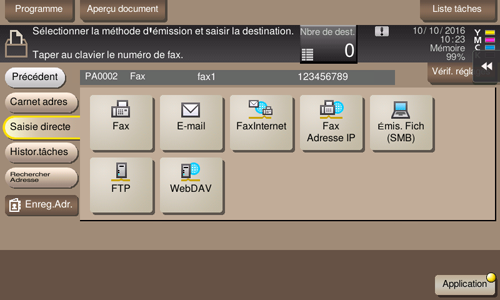 [Fax] | Entrez le numéro de fax du destinataire auquel envoyer un fax. En cas de spécification de plusieurs destinations, tapez sur [Dest. suivante] pour ajouter des destinations. Le fait de taper sur [N° enreg.] vous permet de spécifier une destination de fax par un numéro enregistré. |