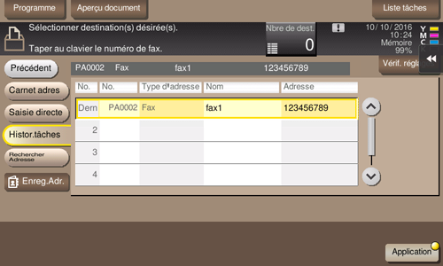 Sélectionnez une destination dans l'historique des tâches. Pour les besoins de l'historique, les dernières tâches (cinq max.) sont affichées. Si nécessaire, vous pouvez sélectionner plusieurs destinations dans l'historique.