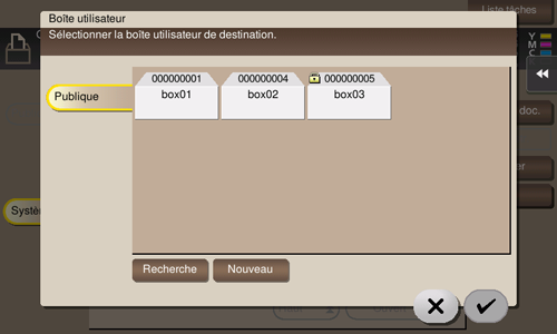 [Recherche] | Cette fenêtre permet de rechercher une boîte utilisateur. Les boîtes utilisateur sont affichées sur la base des caractères de recherche que vous avez spécifié lors de l'enregistrement de la boîte. Vous pouvez également spécifier un numéro de boîte directement sur le clavier. Pour afficher le clavier, tapez sur la zone de saisie des chiffres. |