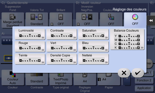 Ajustez la qualité couleur de l'original pour la copie. Vous pouvez vérifier la finition en imprimant un spécimen de copie.