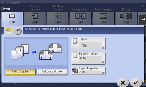 [Papier] | Permet de sélectionner le papier pour la copie. Sélectionnez le papier qui correspond au format d'une double page du livret. |