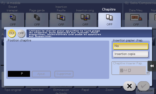 [Chapitre Insérer Pap.] | Si [Insertion papier chap.] est réglé sur [Insertion copie], sélectionnez le magasin papier contenant le papier dédié au chapitre. Si le papier chapitre et le papier texte diffèrent, utilisez le même format de papier et empilez-les dans le même sens. |