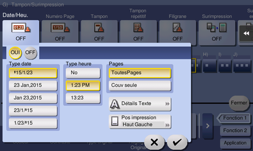 Sélectionnez la position et le format du tampon et ajouter la date et l'heure sur les copies. La date et l'heure peuvent être imprimées soit sur toutes les pages, soit uniquement sur la première page.