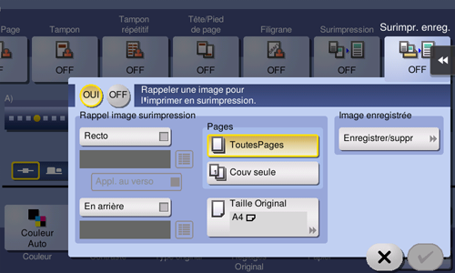 [MARCHE]/ [ARRET] | Sélectionnez [OUI] pour enregistrer une nouvelle image de surimpression ou composer une image de surimpression enregistrée sur l'original. |