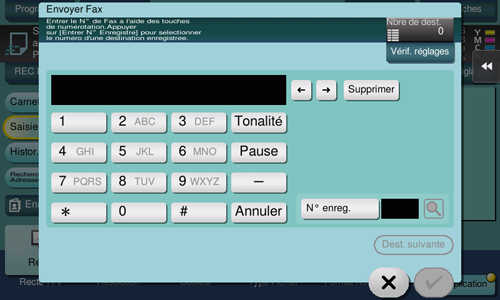 Entrez un numéro de fax de destination lorsque les données de l'original numérisé sont envoyées par fax. En cas de spécification de plusieurs destinations, tapez sur [Dest. suivante] pour ajouter des destinations.