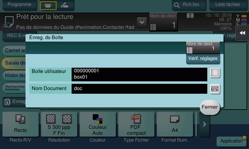 [Boîte utilisateur] | Sélectionnez une boîte utilisateur pour l'enregistrement. Tapez sur [Enregistrer] pour créer une nouvelle boîte utilisateur. |