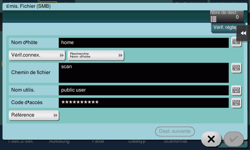 [Référence] | Sur l'écran tactile, recherchez un ordinateur auquel envoyer un fichier et sélectionnez un dossier partagé cible. Lorsque l'écran d'authentification apparaît, entrez le nom et le mot de passe d'un utilisateur possédant des privilèges pour accéder au dossier sélectionné. Après authentification, [Nom d'hôte] ou [Chemin de fichier] est renseigné automatiquement. La fonction Référence peut ne pas s'exécuter dans les conditions suivantes.