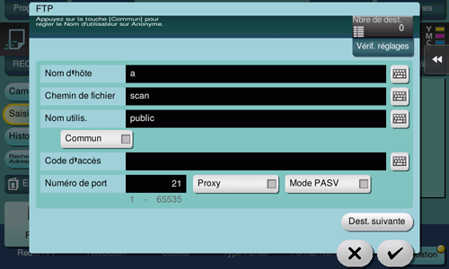 Entrez un nom d'hôte de serveur FTP de destination ou une adresse IP lorsque les données de l'original numérisé sont envoyées à un serveur FTP.
