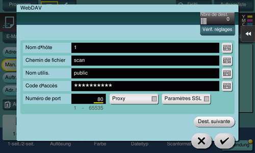 [Chemin de fichier] | Saisissez le nom d'un dossier de destination sur le serveur WebDAV spécifié dans [Nom d'hôte] 'jusqu'à 142 octets).
