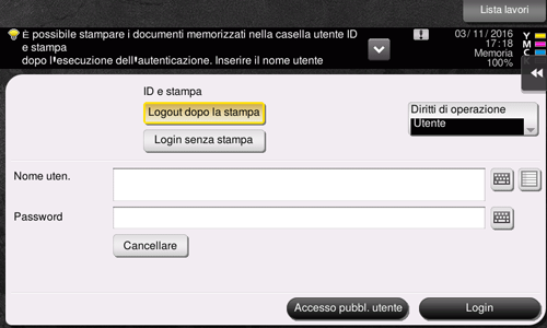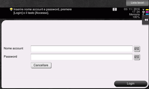 Se sulla macchina sono installate l'autenticazione utente o la registrazione account, la schermata Login verrà visualizzata sul Panello a sfioramento.