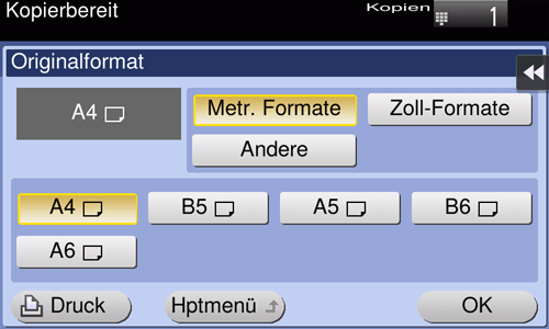 [Metr. Formate] | Wählen Sie diese Option zum Scannen eines Originals mit metrischen Maßen. Tippen Sie auf [Metr. Formate] und wählen Sie das entsprechende metrische Standardformat. |