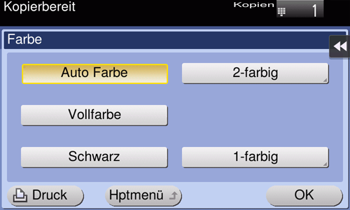 [1-farbig] | Erstellen Sie die Kopie in der angegebenen Einzelfarbe. Dies senkt die Kosten für eine Farbkopie im Vergleich zum Vollfarbdruck. Beim Kopieren des Originals werden die Farbunterschiede (sichtbare Farbdichte) und die Abstufungen zu den Dichtedifferenzen der Einzelfarbe umgewandelt. |
