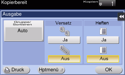 [Offset] | Wählen Sie [Ja], wenn die Ausgabe nach Kopien oder nach Seiten sortiert werden soll. Diese Funktion ist nur im bizhub C3851FS verfügbar. |