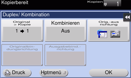 [Original > Kopie] | Wählen Sie eine Kombination des einzulegenden Originals (1-seitiges Original oder 2-seitiges Original) und die Kopiermethode (1-seitige Kopie oder 2-seitige Kopie). Zum Scannen eines 2-seitigen Originals geben Sie unter [Originalbindungsrichtung] an, ob das Original auf "Bindung oben" oder "Bindung links/Bindung rechts" gesetzt werden soll. Zum Erstellen einer 2-seitigen Kopie geben Sie unter [Ausgabebind.- richtung.] an, ob eine Kopie auf "Bindung oben" oder "Bindung links/Bindung rechts" gesetzt werden soll. |