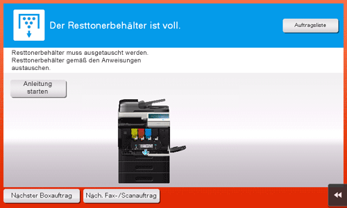 Wenn der Resttonerbehälter voll ist, wird eine Meldung angezeigt, in der Sie zum Wechsel des Behälters aufgefordert werden. Führen Sie den Austausch gemäß Wartungsvertrag durch. Tippen Sie auf [Anleitung starten], um die Anleitung für den Austausch am Bildschirm anzuzeigen.