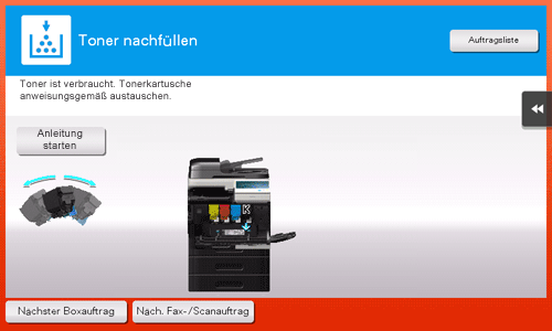 Wenn eine Tonerkartusche ersetzt werden muss, wird eine Meldung mit einer entsprechenden Aufforderung angezeigt. Führen Sie den Austausch gemäß Wartungsvertrag durch. Tippen Sie auf [Anleitung starten], um die Anleitung für den Austausch am Bildschirm anzuzeigen.