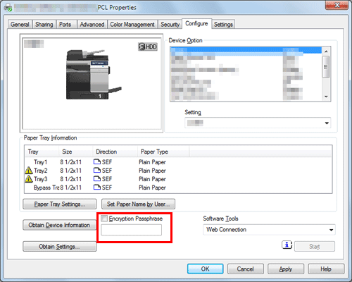 If OpenAPI communication is SSL-encrypted and the device information can be automatically obtained from the printer driver, the encrypted passphrase can be obtained from this machine. For details on how to encrypt OpenAPI communication with SSL, refer to Here.