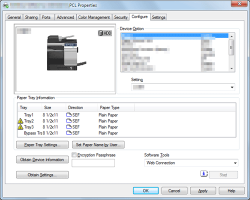 [Obtain Device Information] | The PC communicates with this machine and obtains the optional device installation information. In [Obtain Settings...], set the method of obtaining the information on this machine. | |