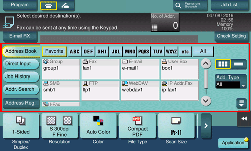 If necessary, you can change the display of the main screen in fax/scan mode (default: [Address Book]). For details, refer to Here.