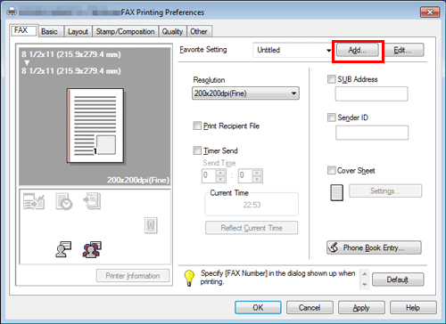The print settings are registered as a favorite. You can select the favorite settings from the [Favorite Setting] list when sending the fax.