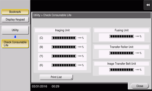Check the status of consumables (consumption level) using the Touch Panel. When necessary, each level can be printed in list form.