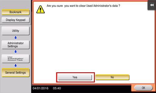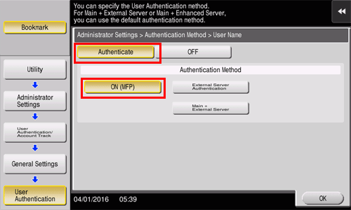 Tap [Utility] - [Administrator Settings] - [User Authentication/Account Track] - [General Settings] - [User Authentication].