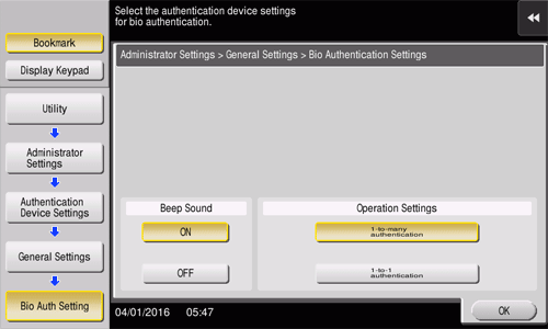 Tap [Authentication Device Settings] - [General Settings] - [Bio Authentication], and configure the following setting.