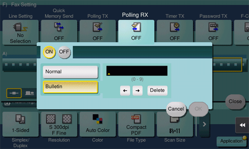 [Bulletin] | Select this option to receive a file stored in a Bulletin User Box. Enter the user box number of the Bulletin Board User Box in the destination machine in which your desired file is stored using the Keypad. To display the Keypad, tap the input area for the numeral. |