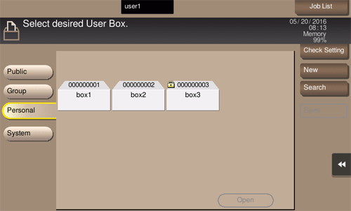 To access a file in this User Box, select the desired User Box, then tap [Open].