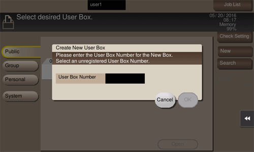 From the Keypad, enter a number of the User Box you wish to register and tap [OK]. To display the Keypad, tap the input area for the numeral.