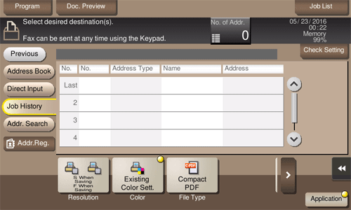 Tap [Job History], and you can select a destination from the scan or fax history. The latest jobs (up to five) are displayed for history purposes. When necessary, multiple destinations can be selected from the history.