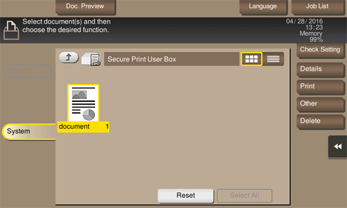 When you print a document from the PC or when you select the Secure Print function using the printer driver, this data file is stored in the Secure Print User Box. Once you have opened the User Box, you can select a file stored in the User Box and preview, print, rename, or delete it.