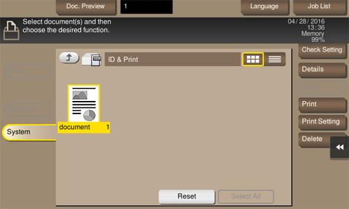When you print a document from the PC in the user authentication system environment, the files transferred with the ID & Print function are stored in the ID & Print User Box. When a user who has sent the print data logs in to this machine and opens the User Box, he/she can preview, print out, or delete the stored file.